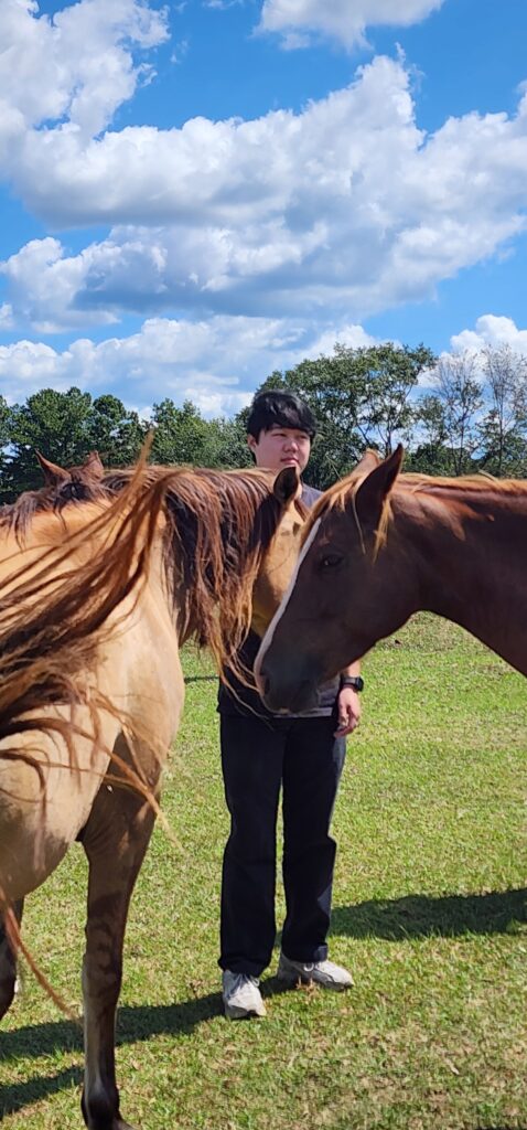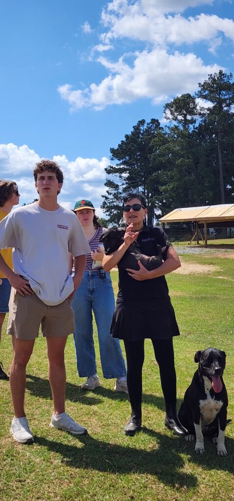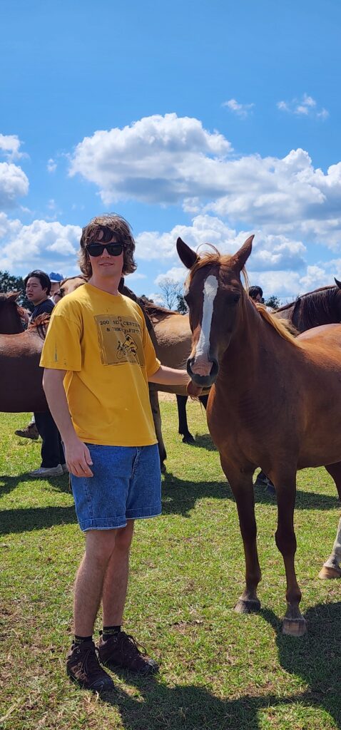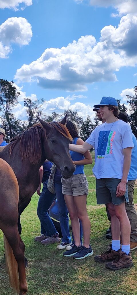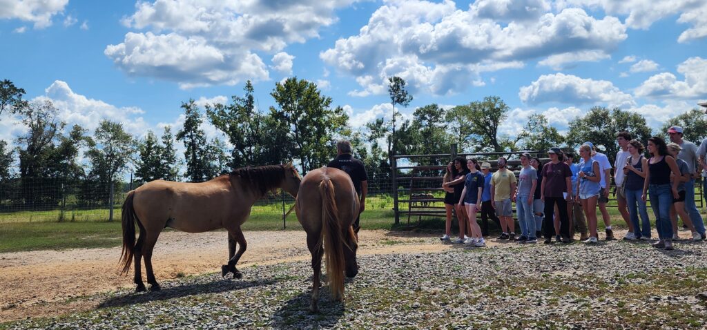 Two years later, we just welcomed our third group of UGA students to the ranch. Although the faces change with each semester, the eagerness, attentiveness and empathy from each student and staff member is constant. In 2023 we had apx. 20 students visit the ranch for that inaugural visit, in 2024 there were a handful more, and in 2025 we welcomed 34 wide grinning bulldogs to our slice of equine-paradise. The number of students has grown, and so have the ideas for the class project. What began as a theoretical assignment has become a practical one– this year’s students have been given creative freedom to design a variety of projects that would be useful at Wild Mustang Ranch. Projects include: storm shelters in the pastures (a need which was made very apparent due to the damage of Hurricane Helene in 2024), water reclamation devices, and renewable energy sources as part of ranch infrastructure. Of their own volition, the students have also come up with a variety of creative ideas related to marketing and spreading awareness about WMR to the general public, these include amazing infographic posters, mustang stickers and temporary freezebrand tattoos! The students’ enthusiasm was palpable during their class visit, and the positive energy was felt by humans and horses alike.